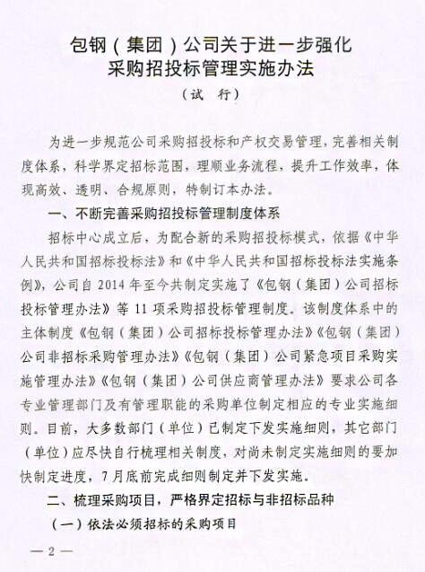 關(guān)于印發(fā)《包鋼(集團(tuán))公司關(guān)于進(jìn)一步強化采購招投標(biāo)管理實施辦法(試行)》的通知